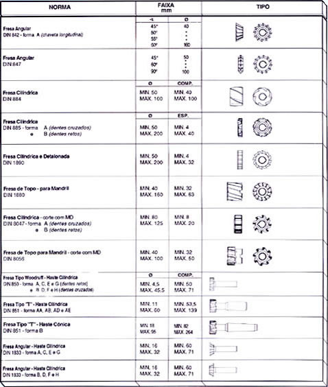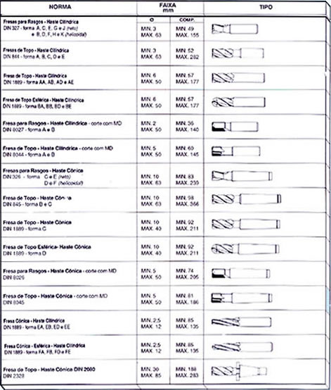 Fabricação e reafiação de fresas especiais de topo reto ou esférico, conforme tabela abaixo ou desenho fornecido pelo cliente. Especificações: